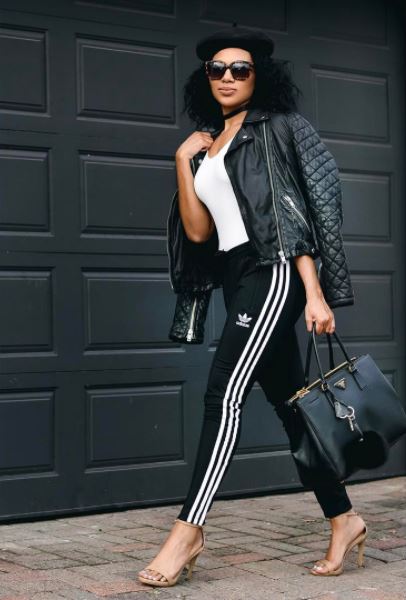 Amanda Du Pont, the South African actress best known as Lelo Mthiyane on Skeem Saam posted a picture of her on Instagram rocking the winter 2017 trend. She was wearing the sporty outfits with brown heels. She decided to go for a black leather jacket instead of wearing the track top and she looked amazing.